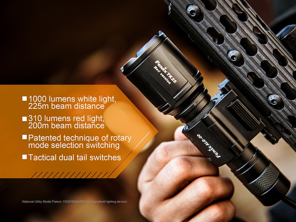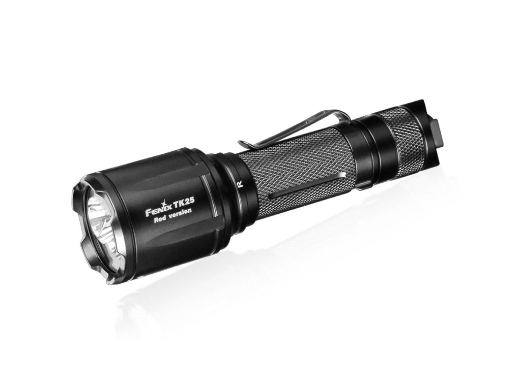 Výkonná taktická svítilna Fenix T K25 Red nabízí špičkový světelný tok až 1000 ANSI lumenů bílého světla a navíc dvě červené LED s výkonem až 310 lumenů a dosvitem 200 metrů. Svítilnu lze napájet ze dvou jednorázových CR123A baterií nebo jednoho vysokokapacitního li-ion 18650 akumulátoru (není součástí balení) . Velmi solidní a voděodolné provedení a dvouvrstvá konstrukce těla předurčuje toto taktické svítidlo do drsných vnějších podmínek, pro profesionály i myslivost. Svítilna Fenix TK25 Red používá duální taktický spínač, který umožňuje rychlejší a spolehlivější ovládání v krizových situacích. Lze ji například snadno zapnout přímo do stroboskopického režimu. Svítilna je napájena digitálně kontrolovaným konstantním proudem pro zaručení stálého světelného výkonu i při snižování napětí v bateriích (při jejich pozvolném vybíjení).