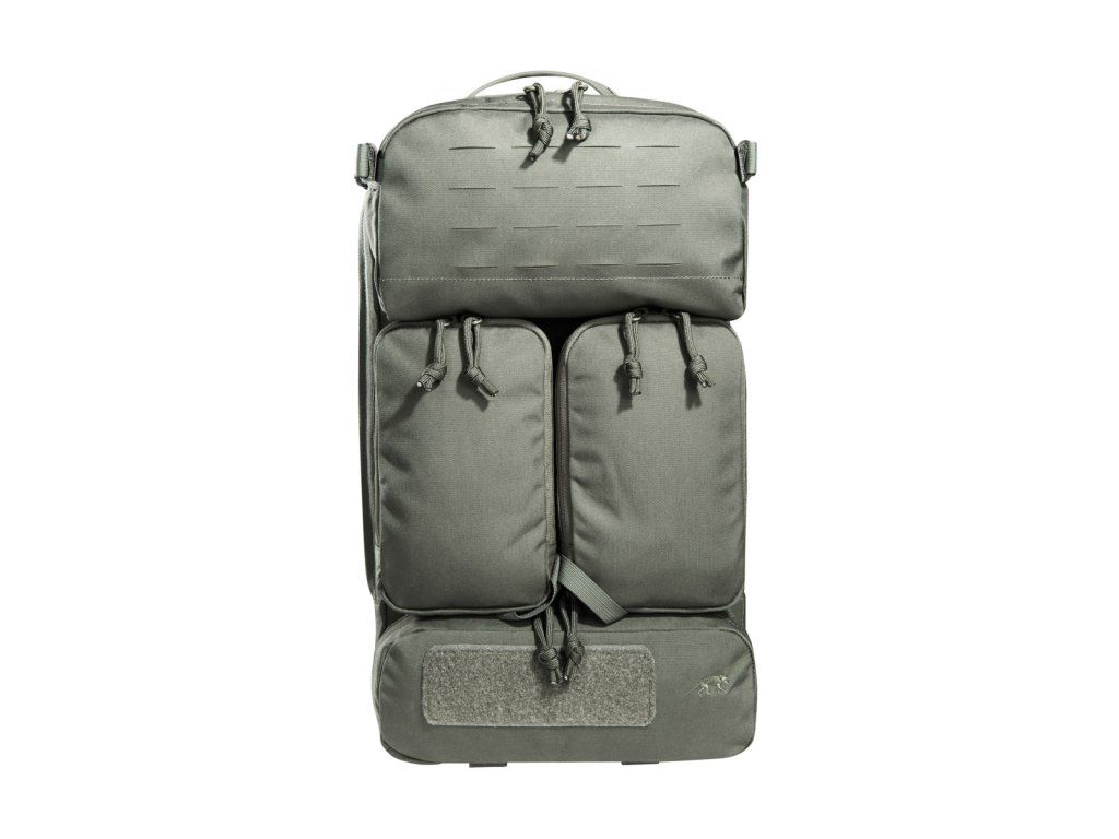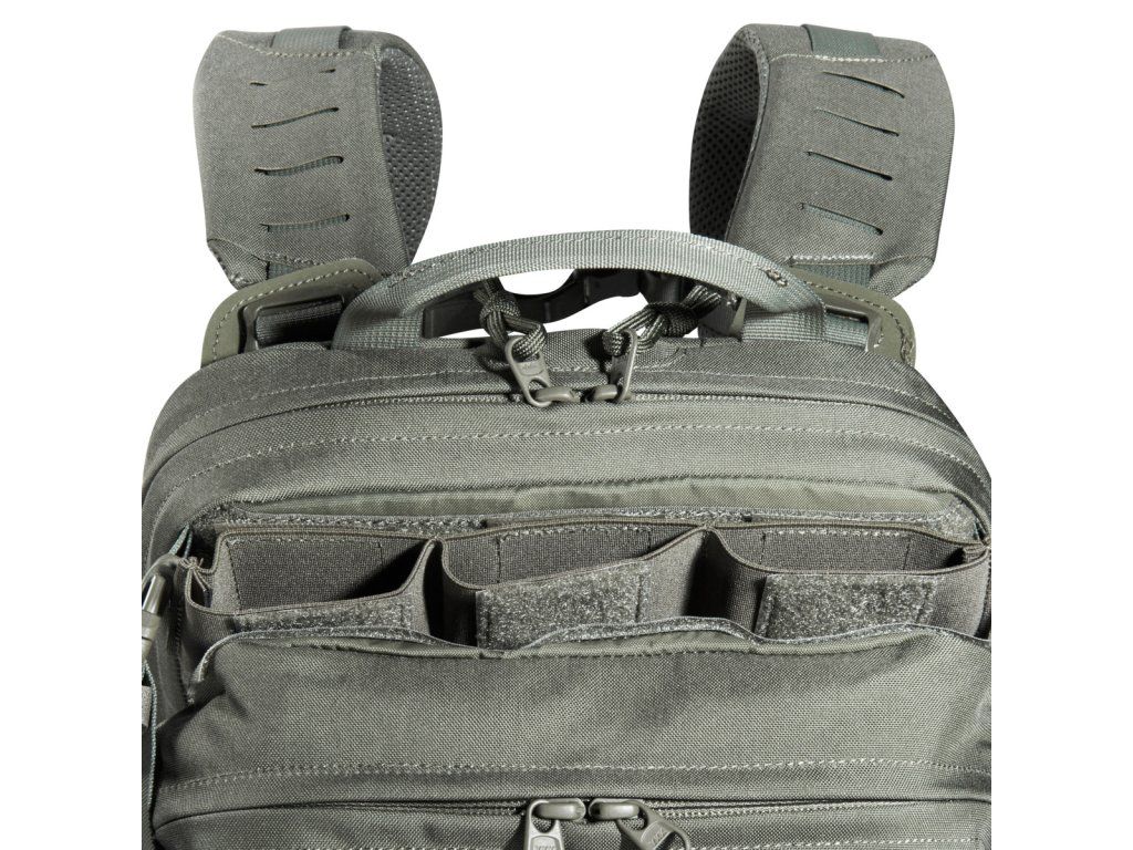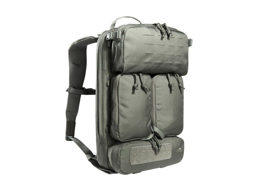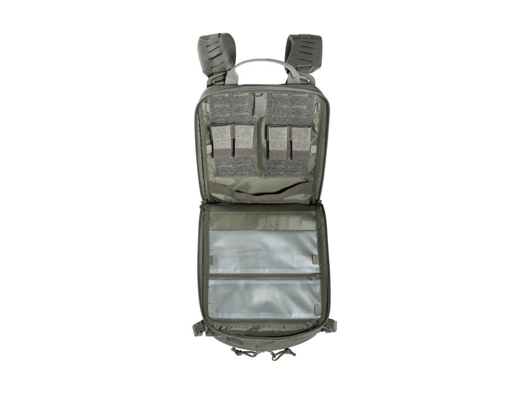 Materiály použité pro tento výpravný batoh jsou velmi lehké, díky čemuž se s ním velmi snadno manipuluje. Má plochý hlavní prostor, který je kompatibilní s hydratačním systémem, a zadní panel je opatřen suchým zipem MOLLE pro přizpůsobitelné uspořádání vaší výbavy. Horní přední kapsa batohu je odklápěcí, za kterou můžete připevnit držák na zásobníky (tři zásobníky). Obě střední přední kapsy jsou odnímatelné a za každým z nich se nachází suchý zip MOLLE. Na spodní přední kapsu lze připevnit pouzdro TT Tac Pouch 12 (položka 7862) nebo záložní pouzdro TT 2 SGL Mag Pouch M4 (položka 7811). Batoh má na zadní straně systém MOLLE, takže jej můžete integrovat do nosiče plátů. K připevnění k nosičům plátů můžete použít také adaptér.