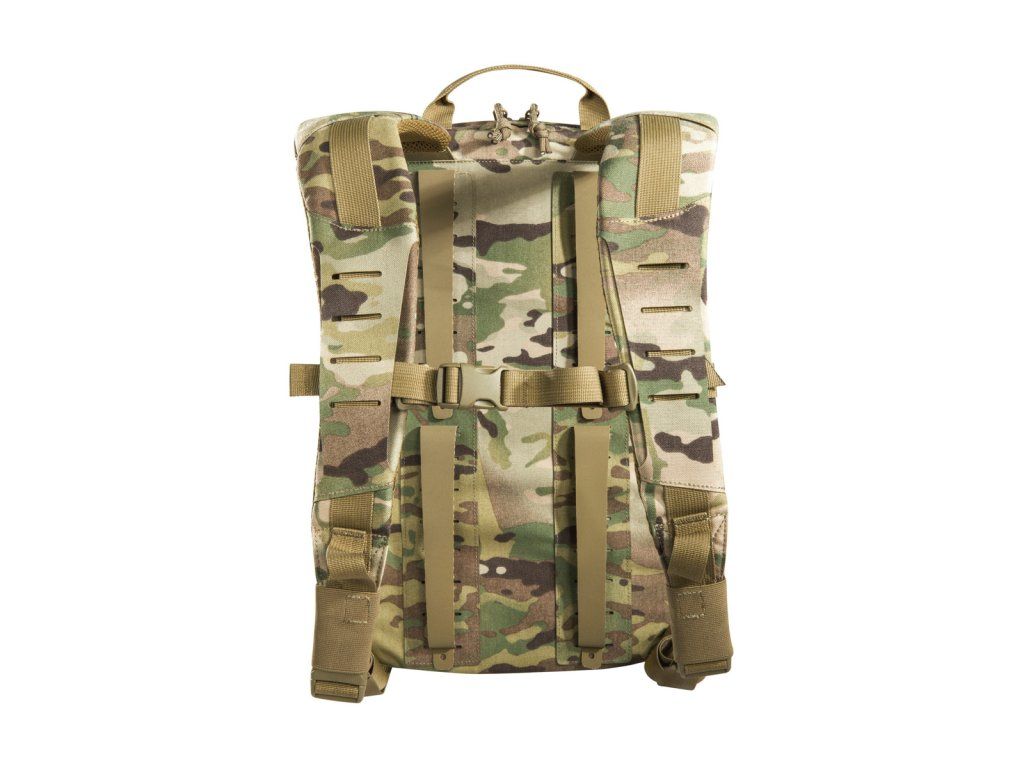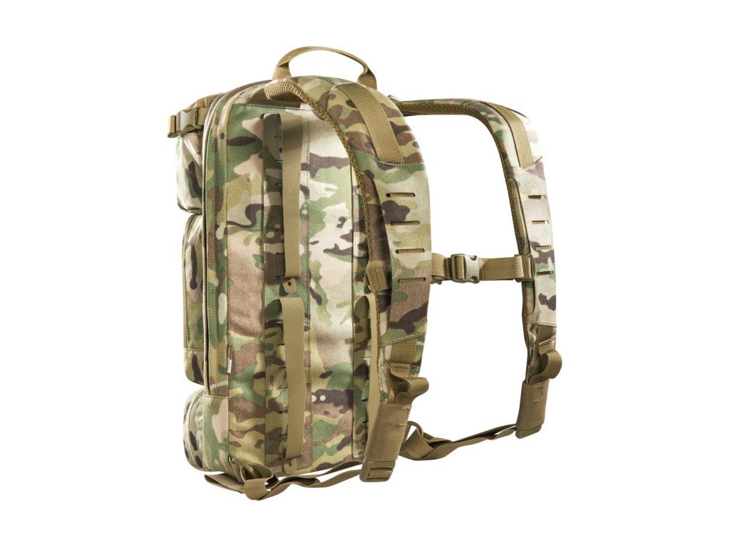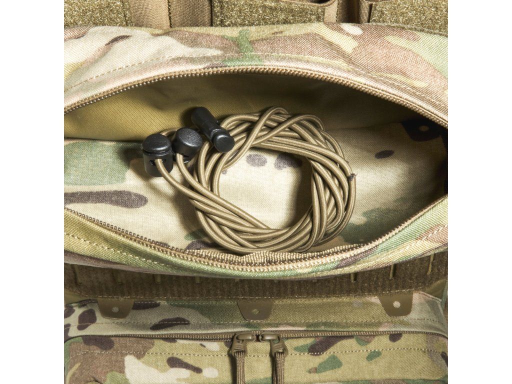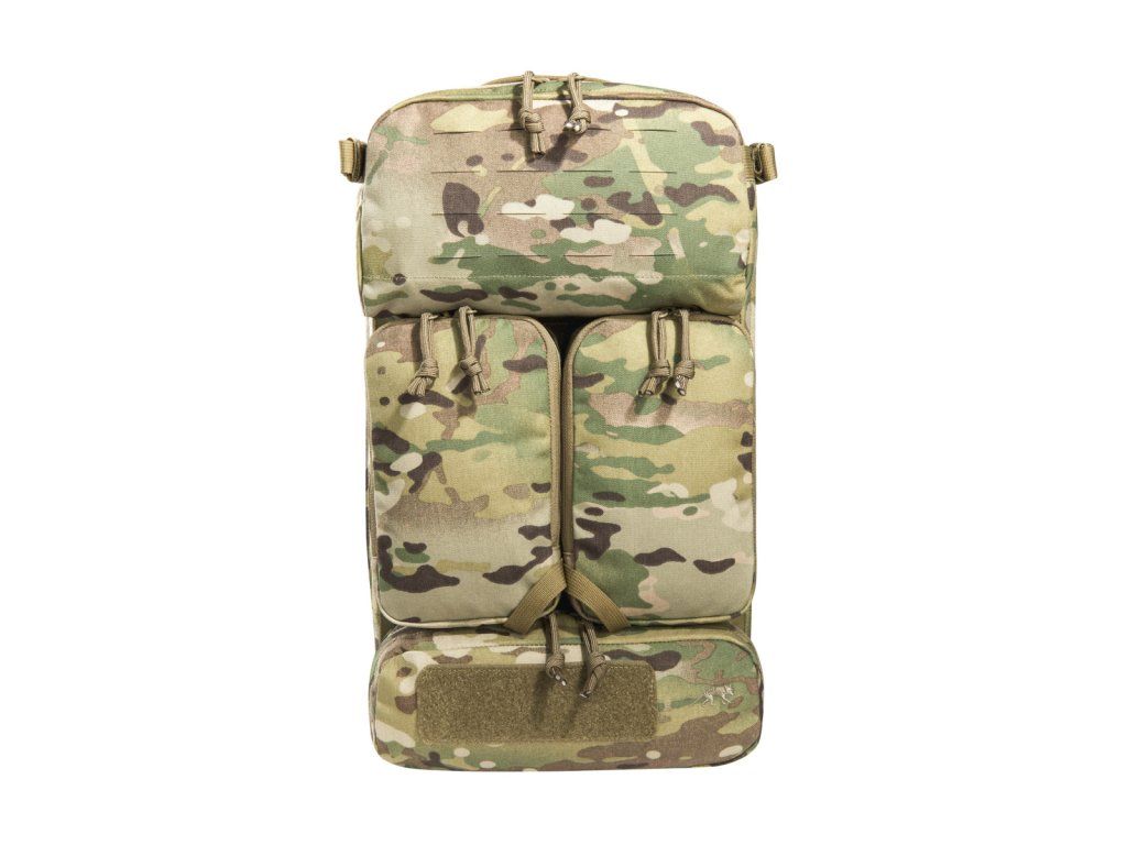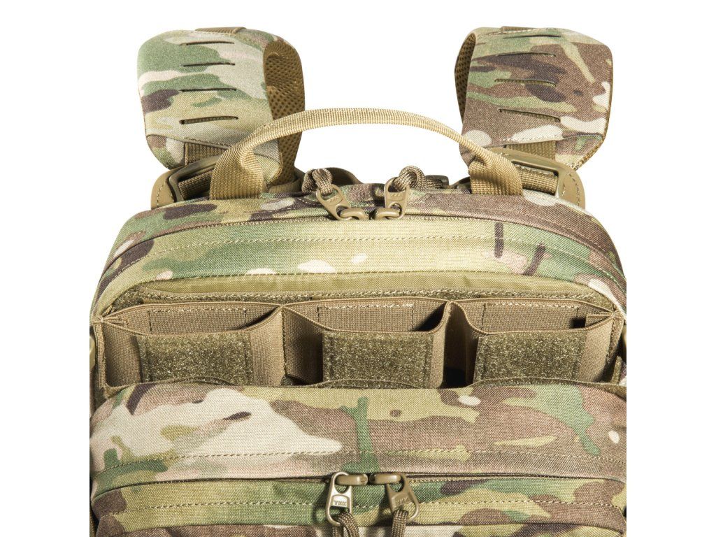 Materiály použité pro tento výpravný batoh jsou velmi lehké, díky čemuž se s ním velmi snadno manipuluje. Má plochý hlavní prostor, který je kompatibilní s hydratačním systémem, a zadní panel je opatřen suchým zipem MOLLE pro přizpůsobitelné uspořádání vaší výbavy. Horní přední kapsa batohu je odklápěcí, za kterou můžete připevnit držák na zásobníky (tři zásobníky). Obě střední přední kapsy jsou odnímatelné a za každým z nich se nachází suchý zip MOLLE. Na spodní přední kapsu lze připevnit pouzdro TT Tac Pouch 12 (položka 7862) nebo záložní pouzdro TT 2 SGL Mag Pouch M4 (položka 7811). Batoh má na zadní straně systém MOLLE, takže jej můžete integrovat do nosiče plátů. K připevnění k nosičům plátů můžete použít také adaptér.