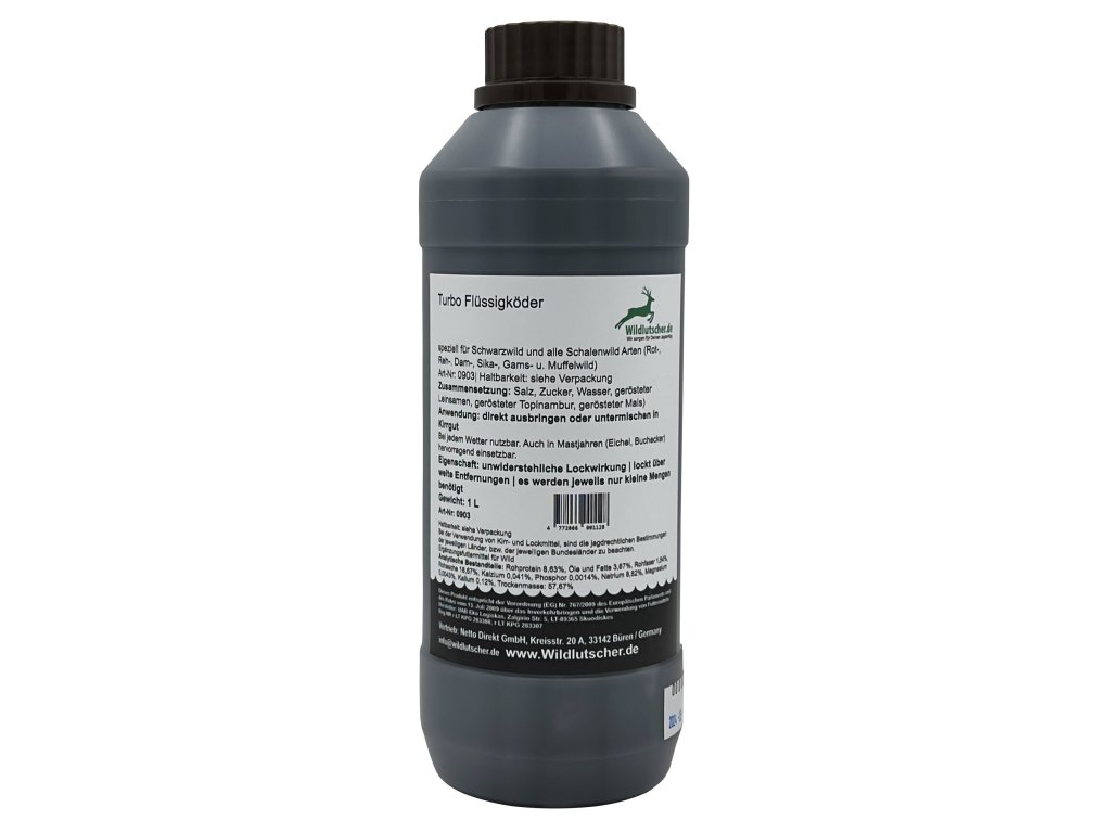 Tekutá návnada Wildlutscher Turbo velmi efektivně vábí divokou sklizeň. Tato tekutá návnada má mimořádně intenzivní vůni a účinně uvolňuje aroma a vnadící prostředky, které jsou účinné na velké vzdálenosti. Dlouhotrvající vůně návnady má silnou přitažlivost, která účinně přitahuje zvěř a udržuje ji v revíru. Tekutou návnadu Wildlutscher Turbo můžete jednoduše použít, například nanést přímo na pařezy, stromy a keře, nebo ji můžete přimíchat do jiné návnady. Návnada si zachovává vysokou účinnost i během období krmení, kdy zkušenosti ukazují, že jiné vnadící výrobky jsou méně účinné.