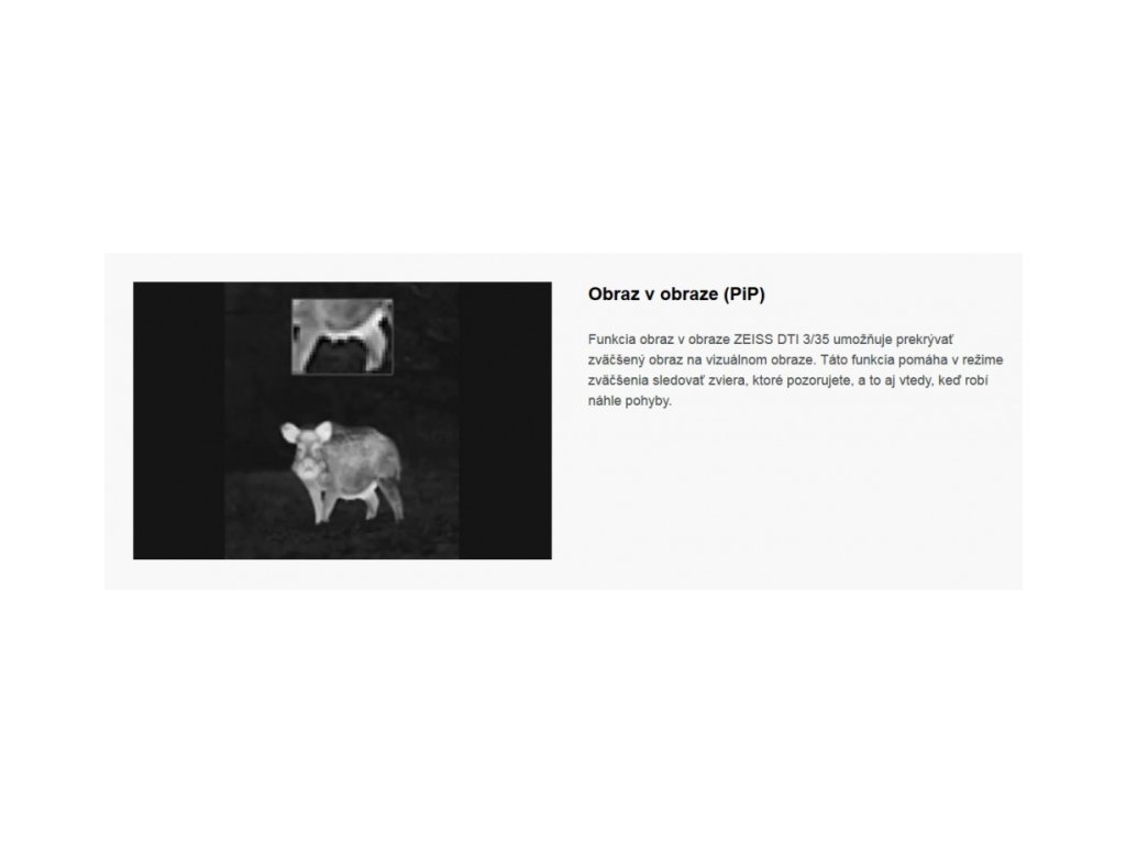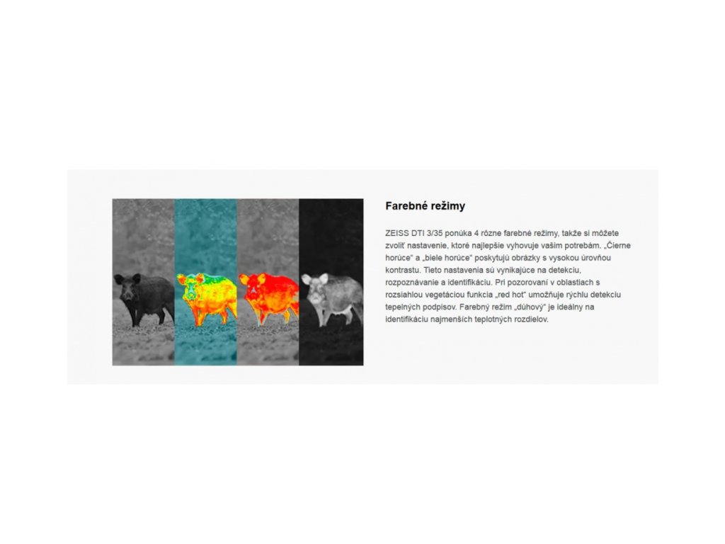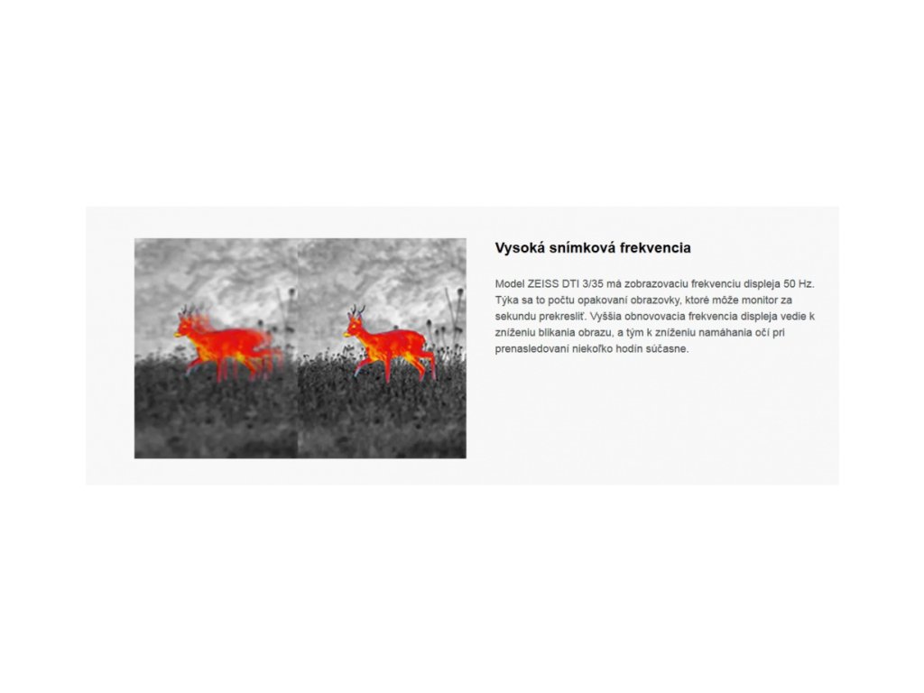 Termovize od společnosti Zeiss nabízí ty nejlepší a nejnapínavější okamžiky během každého lovu. Disponuje dokonalým zobrazováním všech podrobných obrazů ve tmě. Umožňuje tak lovci nejpřesnější určování cíle a dosažení maximálního úspěchu. Náročné podmínky nedělají tomuto zařízení žádný problém. Termovize má kompaktní rozměry a ergonomický design. Díky těmto parametrům se pohodlně drží v každé situaci. Ovládání zařízení je velmi jednoduché a intuitivní. Zabudovaný HD LCOS displej zajišťuje vysoké rozlišení a ta nejlepší pozorování. Přírůstek 0,5násobného zvětšení poskytuje nejpřesnější identifikaci cíle podrobné sledování detailů.