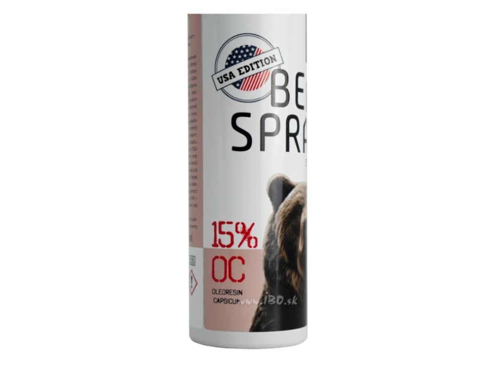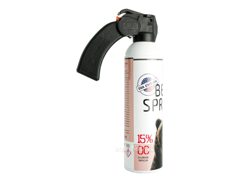 Obranný sprej proti medvědům o objemu 400 ml těch nejkvalitnějších a nejspolehlivějších látek na našem trhu, který byl inspirován USA trhem . Účinná látka sestává z extrémně vysokého obsahu OC (Oleoresin Capsicum) - 15% a látky MC (Major Capsaicinoids) - 2% . Je připraven k použití v mezích nutné obrany nebo krajní nouze při útoku medvěda, šelmy a útočící zvěře, psům a pod. Jeho účinek se dostavuje ihned, a to okamžitou paralýzou vědomí. Sprej je reálně vyzkoušen a testován v praxi. Tlak v nádobě zajišťuje rychlost látky až 114 km/h , díky čemuž je možné jeho použití iv případě protivětru.