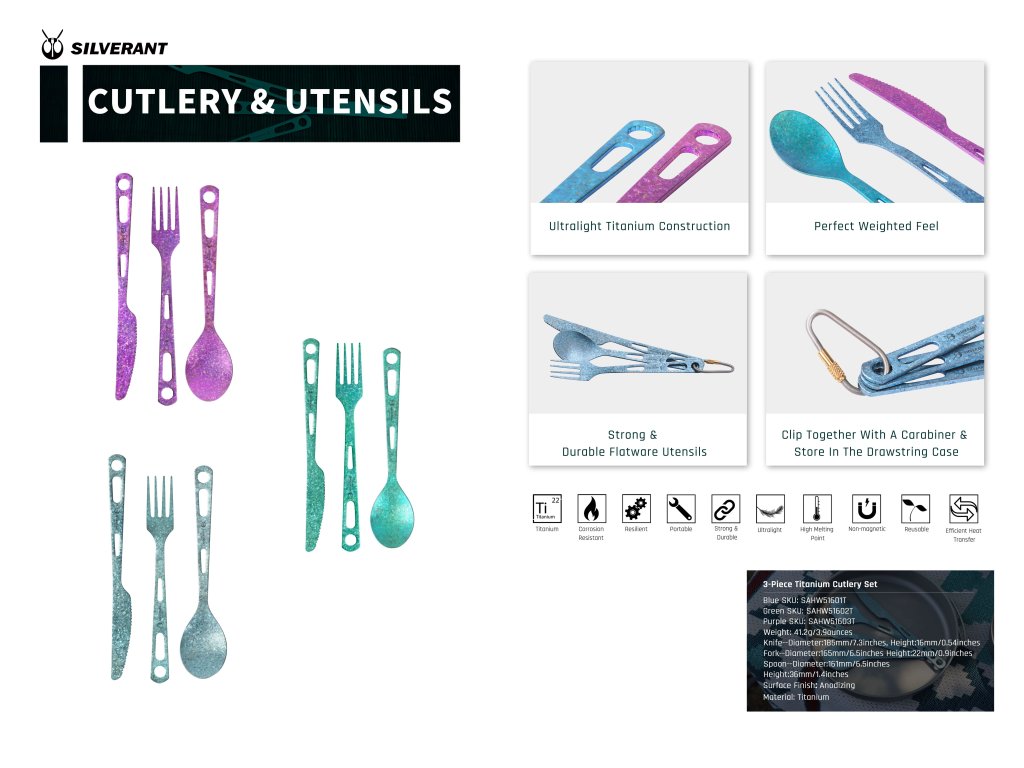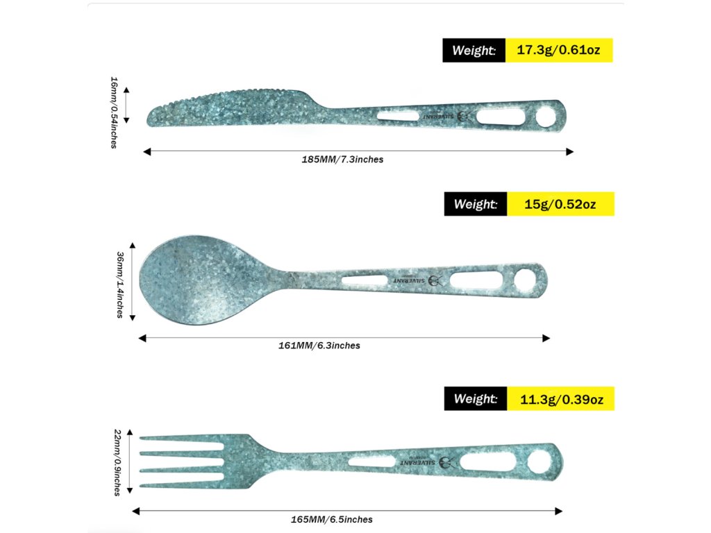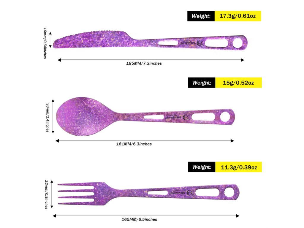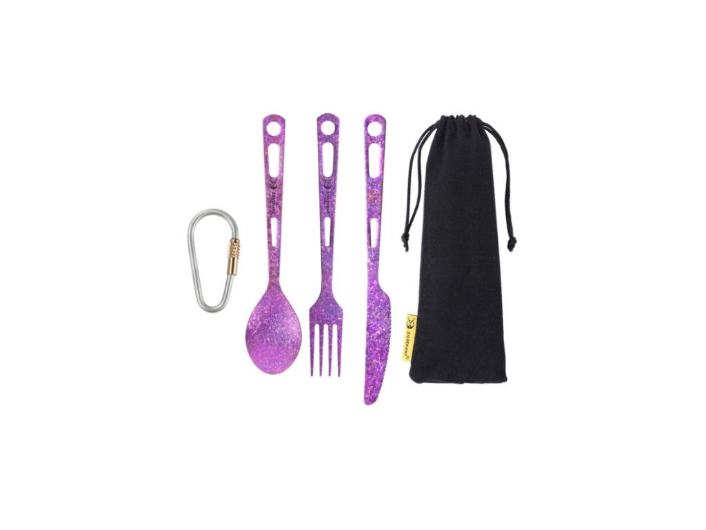 Ultralehká titanová příborová sada obsahuje lžíci, vidličku a nůž. Ať už vyrážíte na chatu, nebo do Himalájí, tento nerozbitný příbor skvěle poslouží a ušetří prostor i hmotnost při všech vašich outdoorových dobrodružstvích. Sada je vyrobena z lehké a extrémně pevné titanové slitiny v barevném provedení s anodizovaným povrchem. Použitý materiál nekoroduje, je hypoalergenní a lze jej mýt v myčce. Neobsahuje BPA.