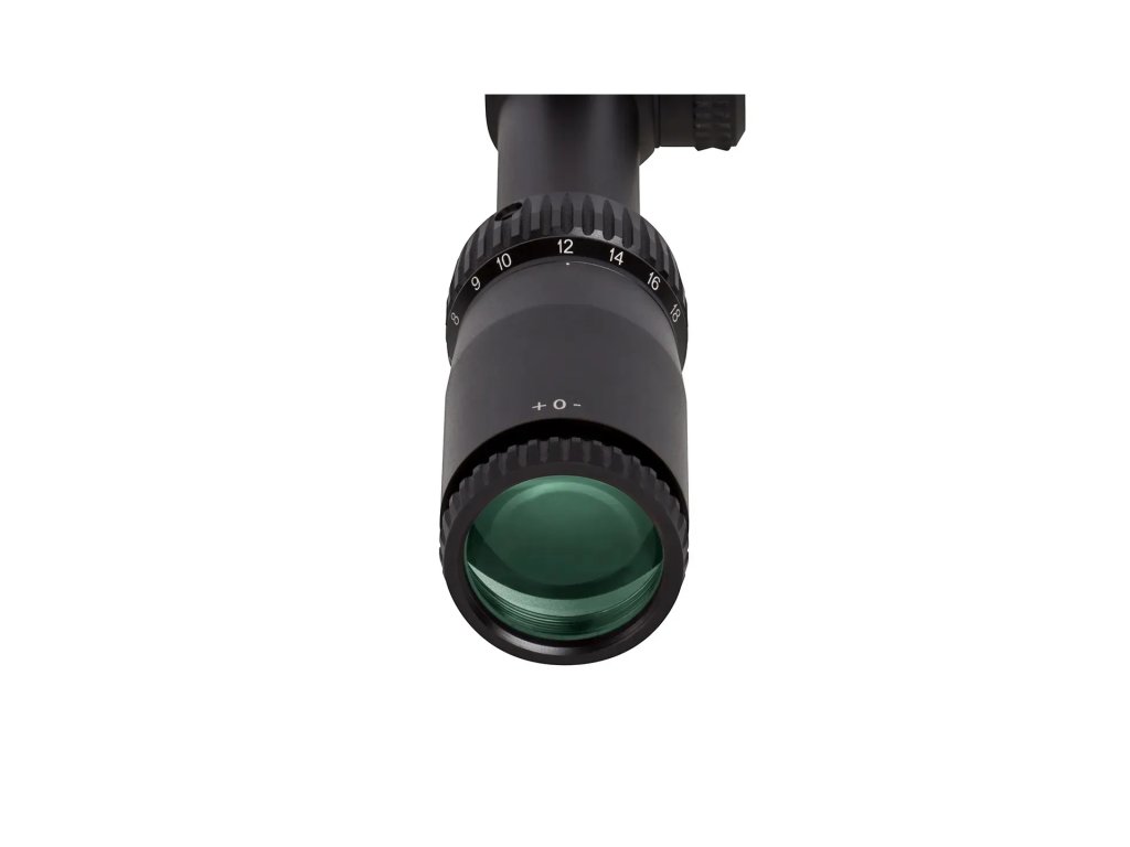 - Jedná se o model ve druhé fokální rovině (velikost kříže se nemění s nastaveným zvětšením, dálkoměrné prvky mají odpovídající velikost při zvětšení 18x)
