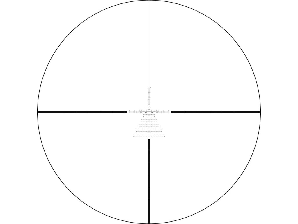 Hash-označená zaměřená osnova pomocí MOA nebo MRAD na bázi subtažných čar na korekce rozsahu, zadržení a větrání. Písmena odkazují na podpony nitkového kříže uvedené v tabulce níže.