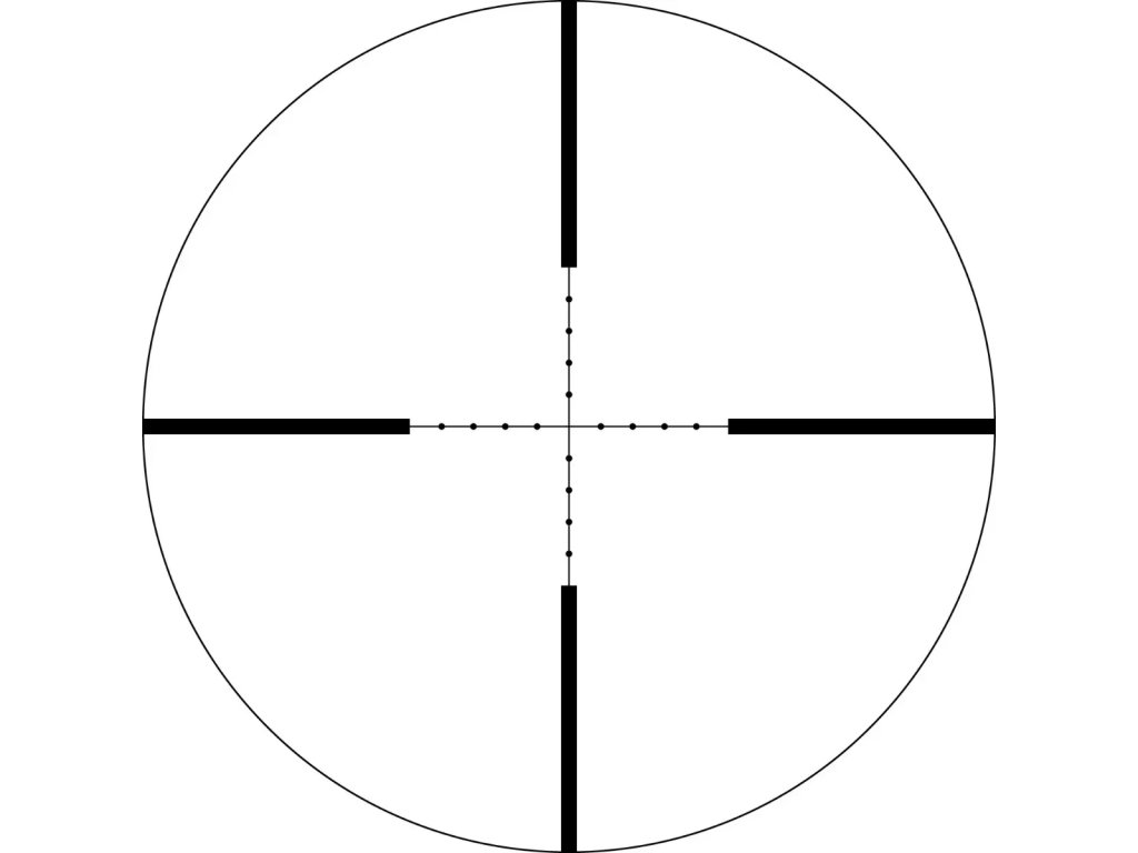 - Záměrný kříž Mil-Dot, pocházející od amerických US Marine Corps., je užitečný při určování vzdálenosti, stranové korekce a propadu akce. Dobrý pomocník pro lovce na dlouhé vzdálenosti.
