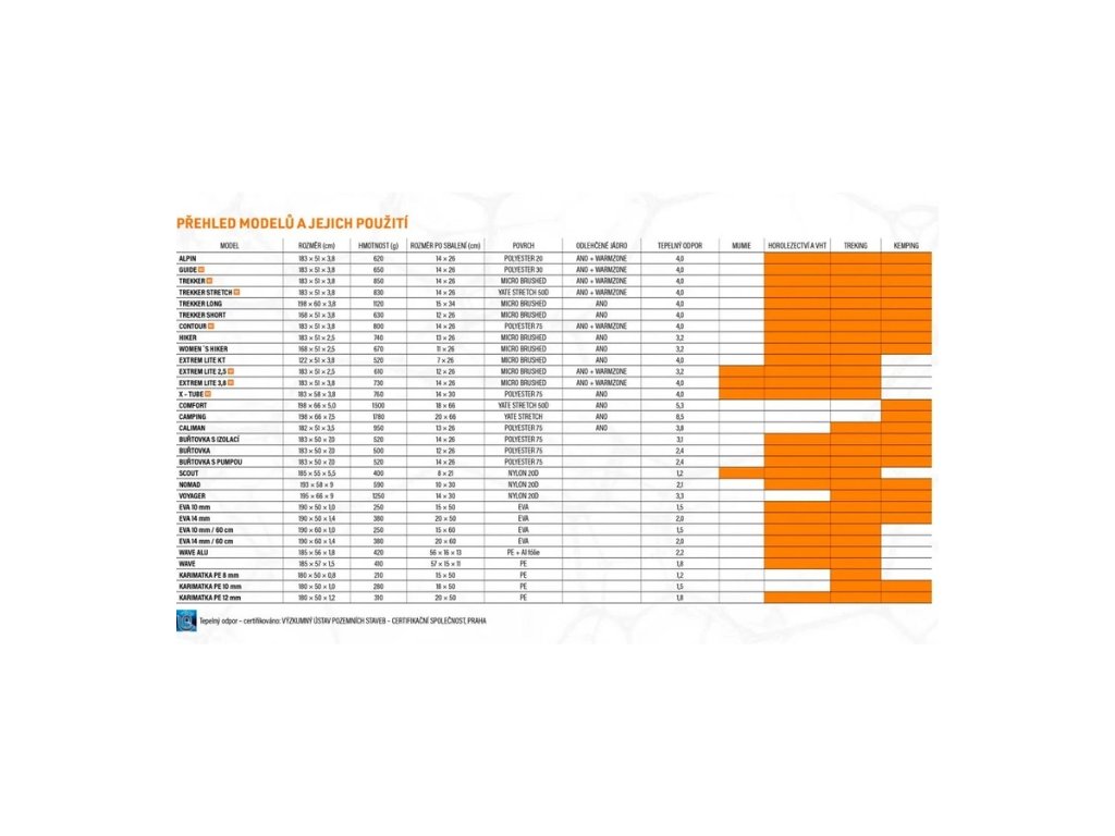 Veličina, která se stále častěji u karimatek udává. Tepelný odpor - R je fyzikální veličina, která vyjadřuje tepelněizolační vlastnosti materiálu. Je přímo závislá na tloušťce materiálu a λ. Při dosahování co nejvyšší hodnoty R je cílem, aby tloušťka materiálu byla co největší a hodnota λ jednotlivých materiálů co nejnižší. Tepelný odpor R vyjadřuje odpor 1 m2 materiálu proti prostupu tepelné energie při rozdílu teplot 1 K. Součinitel tepelné vodivosti λ vyjadřuje vlastnost materiálu vést teplo. Je to hodnota energie ve W, která projde materiálem tloušťky 1 m při rozdílu teplot 1 K mezi povrchy materiálu. Vysvětlivky: R = d / λ (m2.KW-1); d – tloušťka materiálu (m); λ – Součinitel tepelné vodivosti materiálu (Wm-1.K-1).
