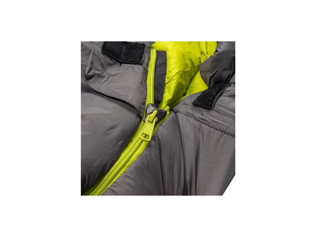 Zapínání: spacák je vybaven značkovým zipem YKK se speciálním plastovým chráničem, který zabraňuje vniknutí látky do jezdce a samovolnému rozepínání. U hlavy je zip ještě zajištěn chlopní na suchý zip, která zamezuje samovolnému otevření zipu.